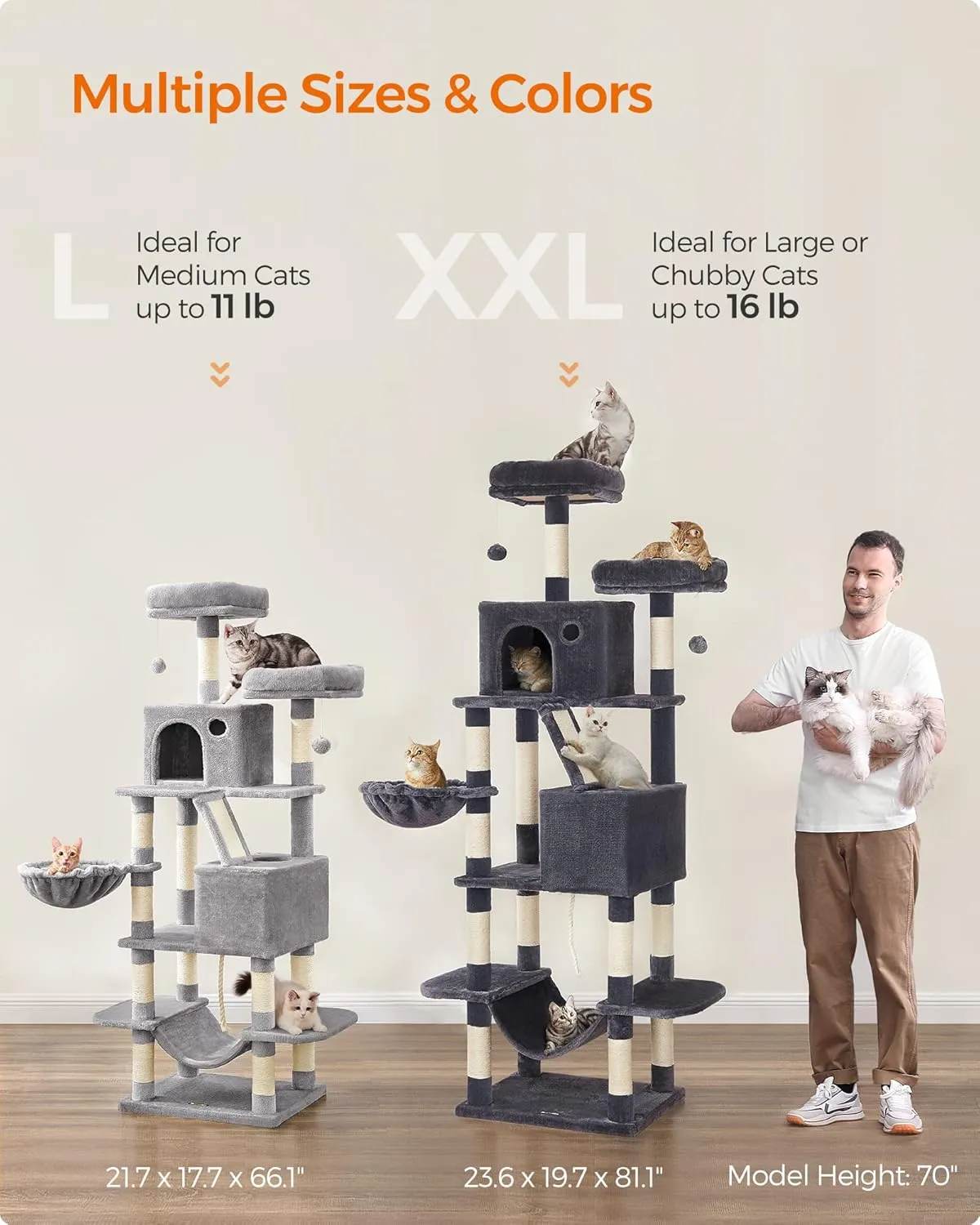 With 5 spacious levels and short steps between platforms, this cat tree for large cats allows your pets to climb, jump, and explore safely. Whether your cat loves high places or prefers cozy hideouts, there’s something for every personality.