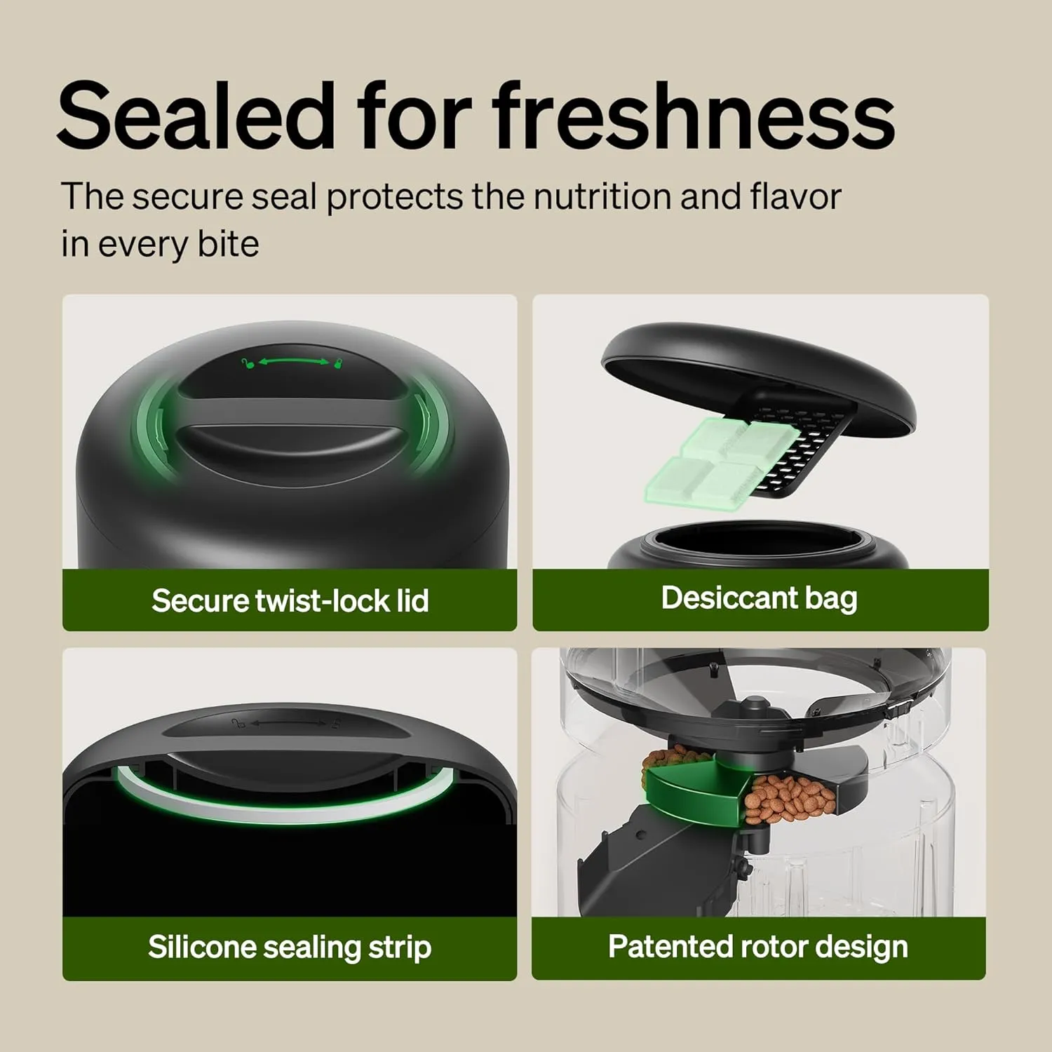 Twist-lock lid, sealed food tank, desiccant bag, and patented rotor keep food fresh and crunchy.